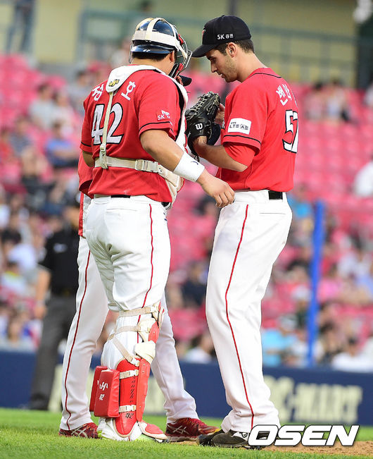 6회말 두산 공격 2사 1, 2루 상황 SK 선발 벤와트와 포수 정상호가 대화를 나누고 있다.