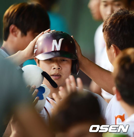 6일 오후 서울 목동구장에서 열린 '2014 한국야쿠르트 세븐 프로야구' 넥센 히어로즈와 롯데 자이언츠 경기, 4회말 2사 주자 없는 상황에서 넥센 윤석민이 솔로포를 날린 후 덕아웃에서 동료들과 하이파이브를 하고 있다.