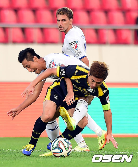 6일 오후 성남 탄천종합운동장에서 열린 '현대오일뱅크 K리그 클래식' 성남 FC와 인천 유나이티드의 경기 후반 인천 남준재와 성남 박진포가 볼 다툼을 벌이고 있다.