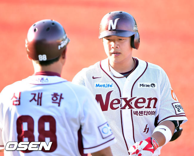 6일 오후 서울 목동구장에서 열린 '2014 한국야쿠르트 세븐 프로야구' 넥센 히어로즈와 롯데 자이언츠 경기, 2회말 무사 주자 2루 넥센 윤석민이 중견수 앞 동점 1타점 적시타를 날린 후 1루에서 심재학 코치와 하이파이브를 하고 있다.