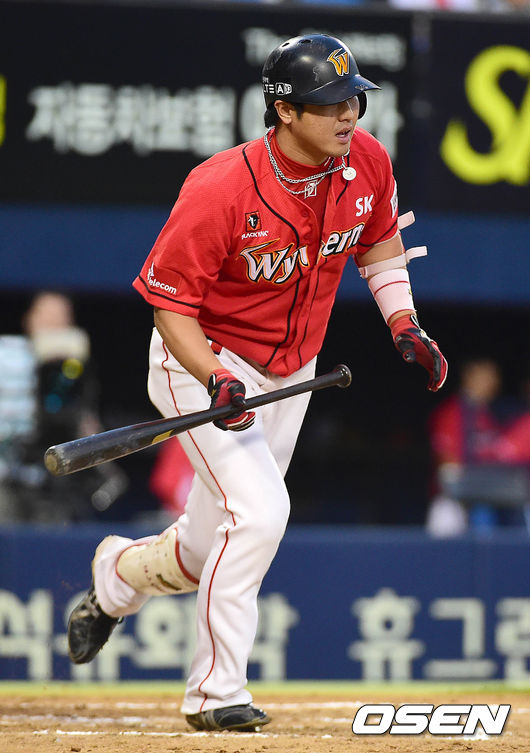 7회초 SK 공격 1사 1, 2루 상황 최정에게 좌월 스리런포를 날리고 1루를 향해 뛰고 있다.