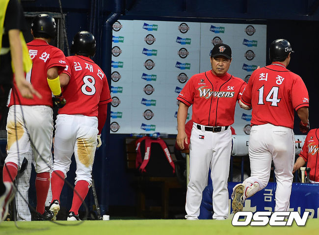 7회초 SK 공격 1사 1, 2루 상황 최정이 두산 선발 유희관을 상대로 좌월 스리런포를 날린 뒤 이만수 감독과 인사를 나누고 있다.
