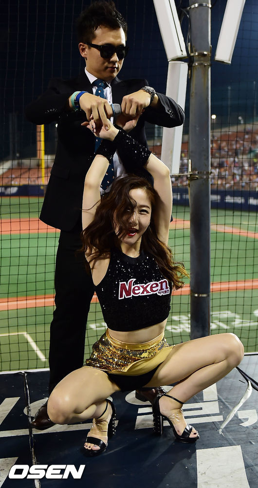 6일 오후 서울 목동구장에서 열린 '2014 한국야쿠르트 세븐 프로야구' 넥센 히어로즈와 롯데 자이언츠 경기, 6회에 넥센 배트걸 정은진이 단상 위에서 화려한 특별 공연을 펼치고 있다.