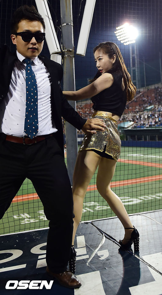 6일 오후 서울 목동구장에서 열린 '2014 한국야쿠르트 세븐 프로야구' 넥센 히어로즈와 롯데 자이언츠 경기, 6회에 넥센 배트걸 정은진이 단상 위에서 화려한 특별 공연을 펼치고 있다.