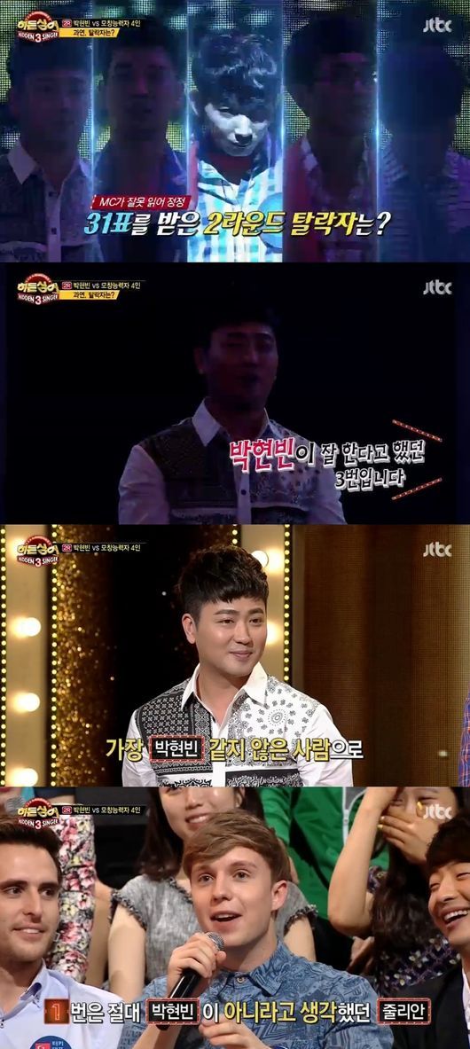 이어 공개된 결과에서 박현빈은 최저 점수인 한 표를 득표했다. 이 한 표는 벨기에 출신 방송인 줄리안이 준 것. 줄리안은 “진짜 아니라고 생각했다”며 당황했다. 0표가 될 뻔한 박현빈의 실력이 대단했다.