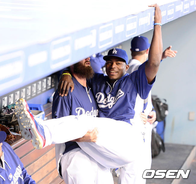 7일(이하 한국시간) 미국 로스엔젤레스 다저스타디움에서 열린 '2014 메이저리그' LA 다저스와 애리조나 다이아몬드백스의 경기, 선발 명단에서 빠진 푸이그가 반 슬라이크와 장난을 치고 있다.