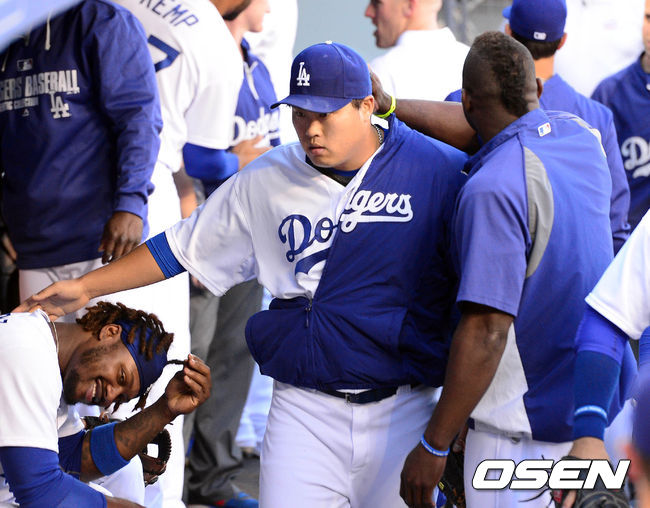 7일(이하 한국시간) 미국 로스엔젤레스 다저스타디움에서 열린 '2014 메이저리그' LA 다저스와 애리조나 다이아몬드백스의 경기,푸이그가 류현진의 어깨를 두드려 주고 있다.