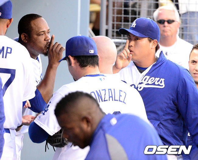 7일(이하 한국시간) 미국 로스엔젤레스 다저스타디움에서 열린 '2014 메이저리그' LA 다저스와 애리조나 다이아몬드백스의 경기, 류현진이 유리베와 장난을 치고 있다.