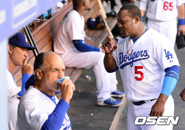7일(이하 한국시간) 미국 로스엔젤레스 다저스타디움에서 열린 '2014 메이저리그' LA 다저스와 애리조나 다이아몬드백스의 경기, 매팅리 감독이 유리베와 장난을 치고 있다.