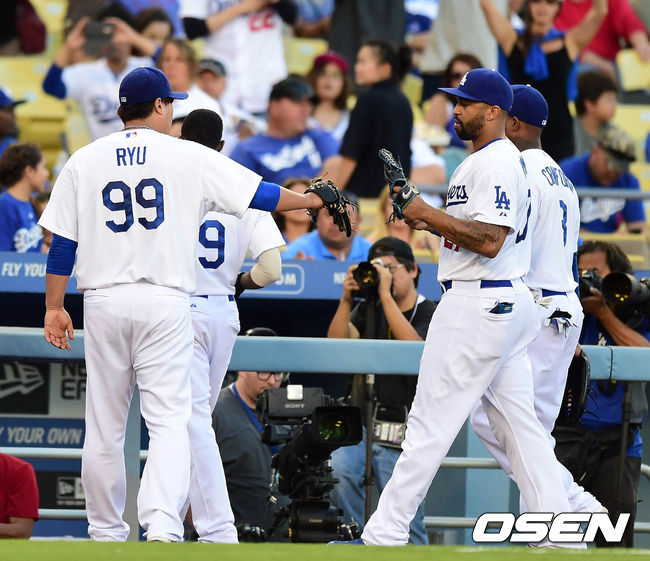 7일(이하 한국시간) 미국 로스엔젤레스 다저스타디움에서 열린 '2014 메이저리그' LA 다저스와 애리조나 다이아몬드백스의 경기,1회초 1사 1루 오윙스의 우익수 플라이를 잡아 1루로 송구 1루주자까지 병살로 처리한 맷 켐프를 류현진이 격려하고 있다.