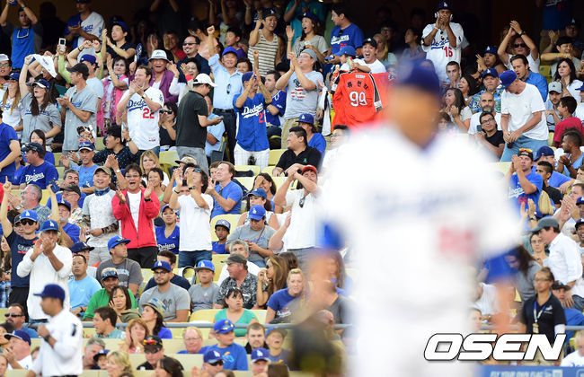 7일(이하 한국시간) 미국 로스엔젤레스 다저스타디움에서 열린 '2014 메이저리그' LA 다저스와 애리조나 다이아몬드백스의 경기,2회초 무사 만루 위기를 무실점으로 마무리하자 팬들이 환호하고 있다.