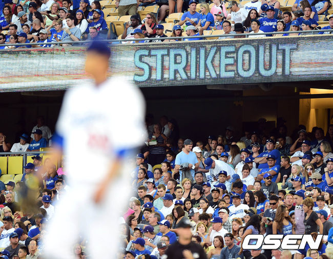 7일(이하 한국시간) 미국 로스엔젤레스 다저스타디움에서 열린 '2014 메이저리그' LA 다저스와 애리조나 다이아몬드백스의 경기,2회초 무사 만루 레이몰드를 류현진이 95마일 직구로 삼진 처리하자 전광판에 삼진 문구가 뜨고 있다.