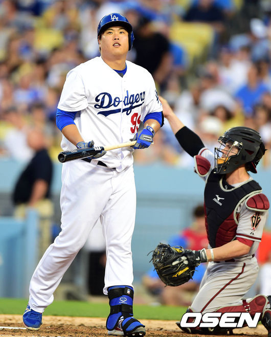 7일(이하 한국시간) 미국 로스엔젤레스 다저스타디움에서 열린 '2014 메이저리그' LA 다저스와 애리조나 다이아몬드백스의 경기,3회말 선두타자로 나선 류현진이 삼진으로 물러나고 있다.