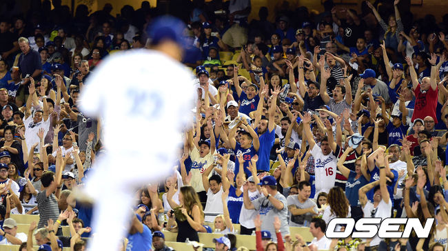 7회초 2사 3루 폴락을 상대하는 류현진을 다저스 팬들이 열렬히 응원하고 있다./jpnews@osen.co.kr