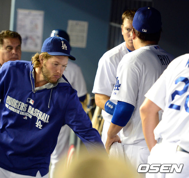 7회초 2사 3루서 폴락에게 동점타를 맞은 류현진이 마운드를 내려와 아쉬워 하자 커쇼가 위로하고 있다./jpnews@osen.co.kr