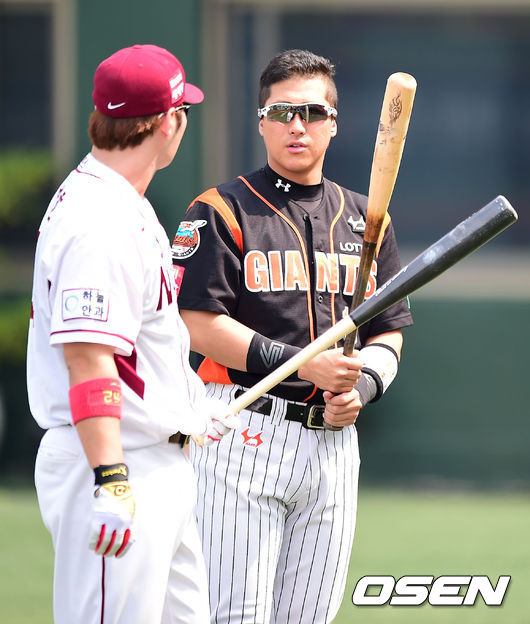 7일 오후 서울 목동구장에서 열린 '2014 한국야쿠르트 세븐 프로야구' 넥센 히어로즈와 롯데 자이언츠 경기, 경기 전 넥센 박병호와 롯데 황재균이 얘기를 나누고 있다.