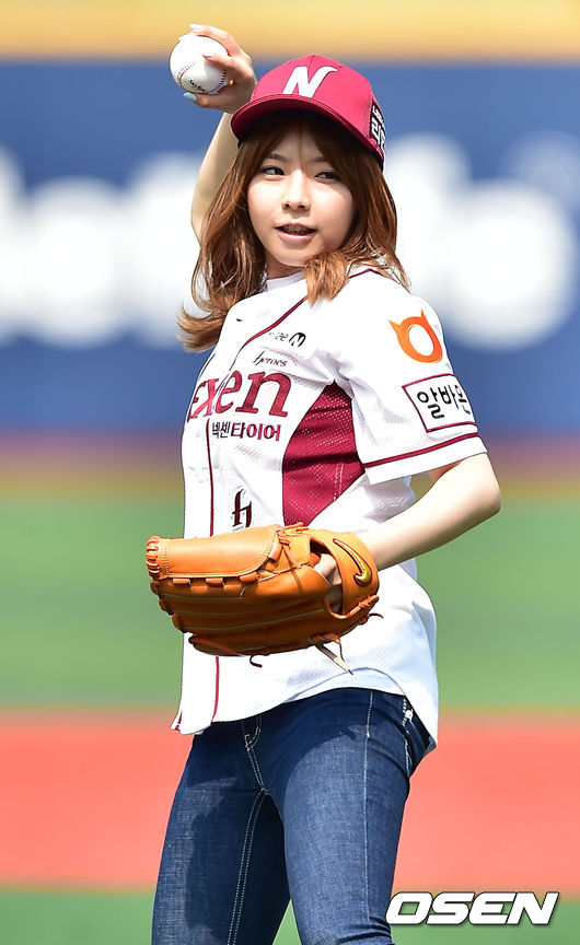 7일 오후 서울 목동구장에서 열린 '2014 한국야쿠르트 세븐 프로야구' 넥센 히어로즈와 롯데 자이언츠 경기, 경기 전 싱어송라이터 주니엘(21)이 승리기원 시구를 하고 있다.