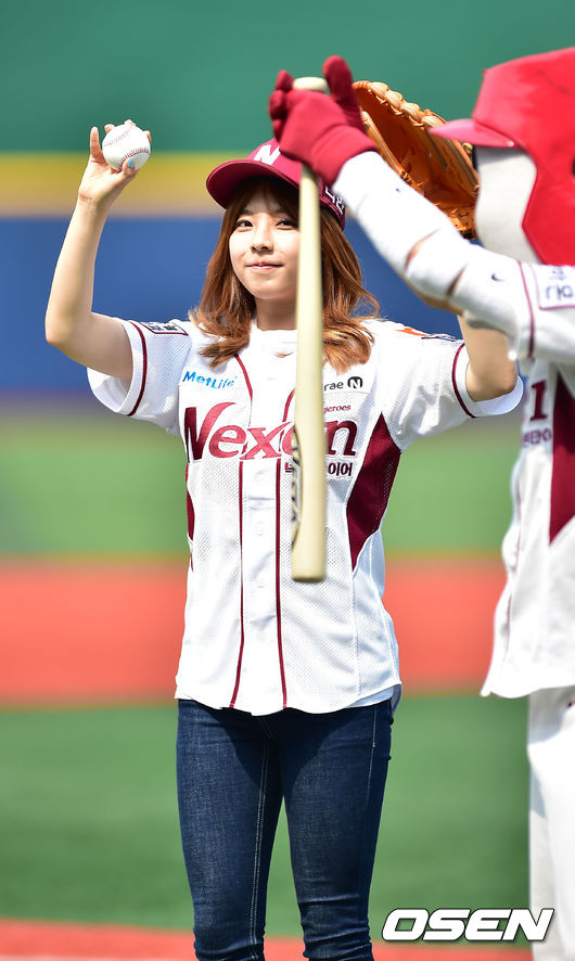 7일 오후 서울 목동구장에서 열린 '2014 한국야쿠르트 세븐 프로야구' 넥센 히어로즈와 롯데 자이언츠 경기, 경기 전 싱어송라이터 주니엘(21)이 승리기원 시구를 한 후 인사를 하고 있다.