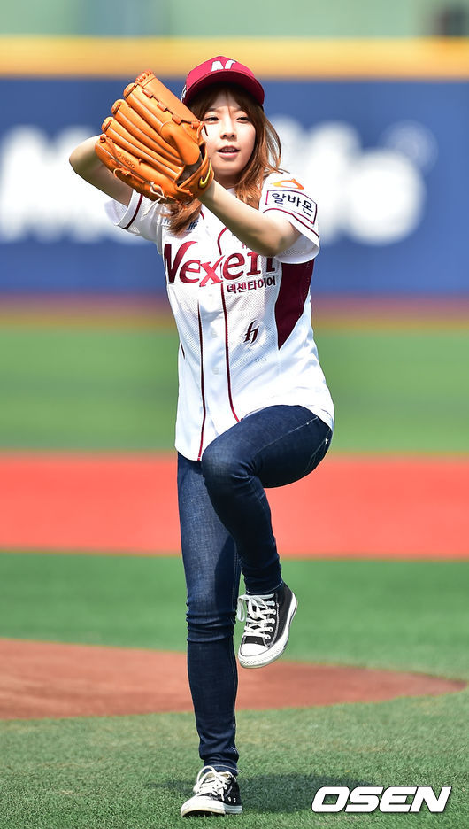 7일 오후 서울 목동구장에서 열린 '2014 한국야쿠르트 세븐 프로야구' 넥센 히어로즈와 롯데 자이언츠 경기, 경기 전 싱어송라이터 주니엘(21)이 승리기원 시구를 하고 있다.