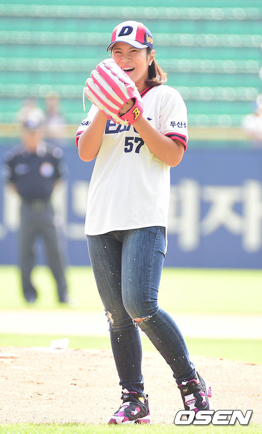시구자로 나선 프로골퍼 윤슬아가 공을 던지기 앞서 미소짓고 있다.
