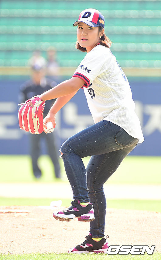 시구자로 나선 프로골퍼 윤슬아가 힘차게 공을 던지고 있다.