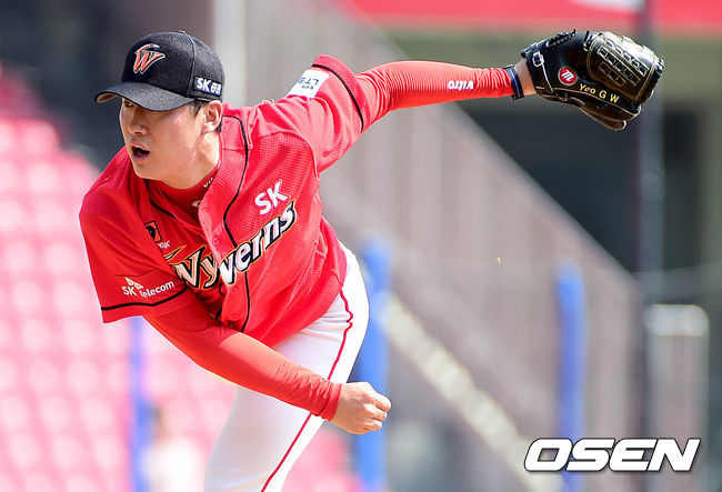 SK 선발 여건욱이 힘차게 공을 뿌리고 있다.
