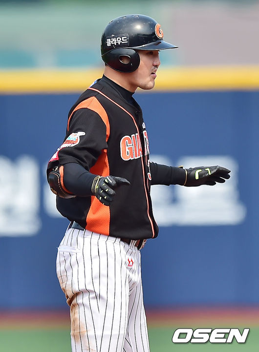 7일 오후 서울 목동구장에서 열린 '2014 한국야쿠르트 세븐 프로야구' 넥센 히어로즈와 롯데 자이언츠 경기, 1회초 2사 주자 1,2루 롯데 박종윤이 우익수 오른쪽 선취 1타점 적시타를 날린 후 2루에서 사인을 보내고 있다.