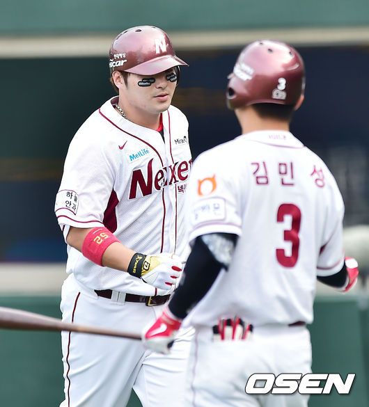7일 오후 서울 목동구장에서 열린 '2014 한국야쿠르트 세븐 프로야구' 넥센 히어로즈와 롯데 자이언츠 경기, 2회말 선두타자 넥센 박병호가 좌중월 솔로 홈런을 날린 후 홈에서 김민성과 하이파이브를 하고 있다. (47호)