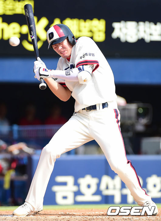 2회말 두산 공격 2사 1, 2루 상황에서 김재호가 SK 선발 여건욱의 몸쪽 높은 공에 깜짝 놀라고 있다.