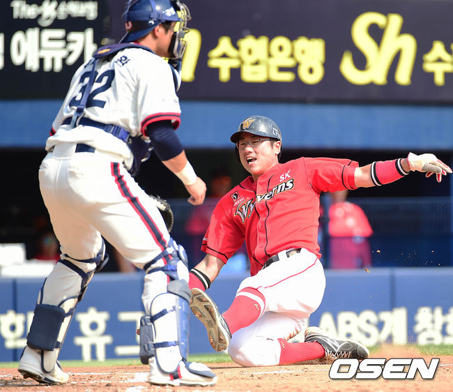 3회초 SK 공격 2사 2루 상황 김강민의 1타점 적시타 때 2루주자 박정권이 홈까지 내달려 세이프되고 있다.