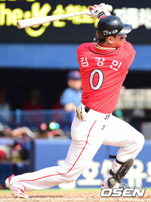 3회초 SK 공격 2사 2루 상황 김강민이 1타점 좌전 적시타를 날리고 있다.