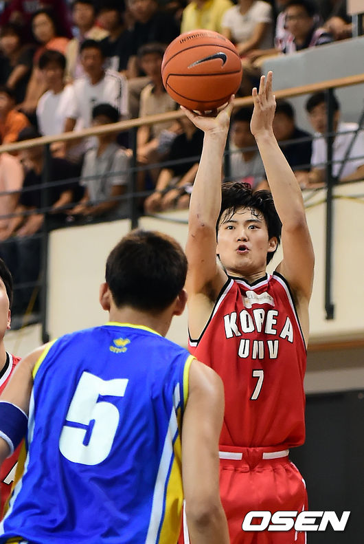 7일 오후 서울 신촌 연세대체육관에서 열린 '2014 KB국민은행 대학농구리그 챔피언결정전' 3차전 경기, 1쿼터 고려대 이동엽이 점프슛을 시도하고 있다.