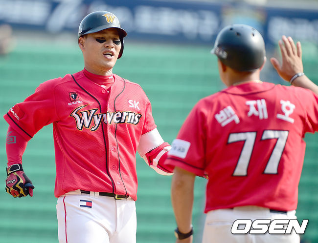 3회초 SK 공격 2사 2루 상황 김상현이 1타점 좌전 적시타를 날린 뒤 1루에 안착해 백재호 코치와 인사를 나누고 있다.