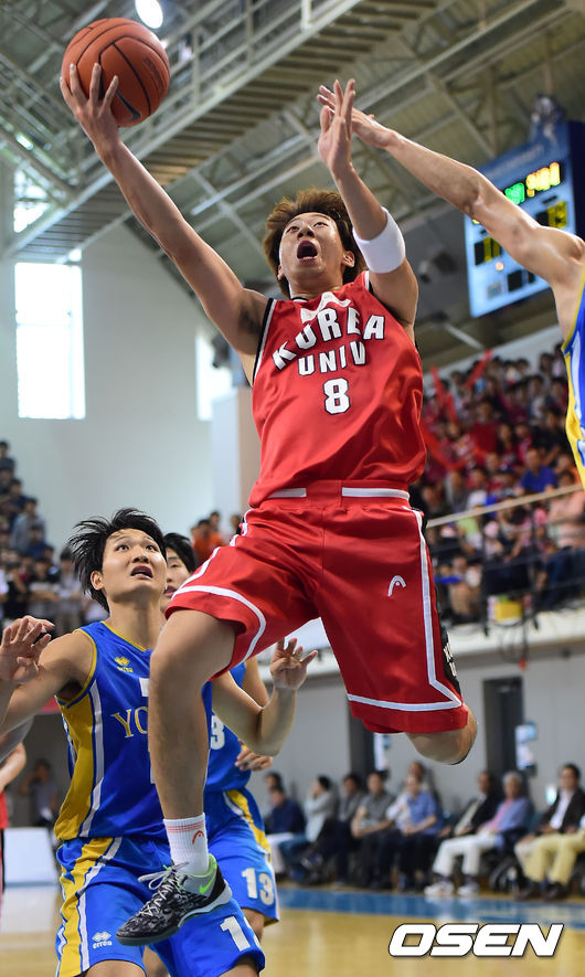 7일 오후 서울 신촌 연세대체육관에서 열린 '2014 KB국민은행 대학농구리그 챔피언결정전' 3차전 경기, 1쿼터 고려대 김지후가 레이업을 시도하고 있다.