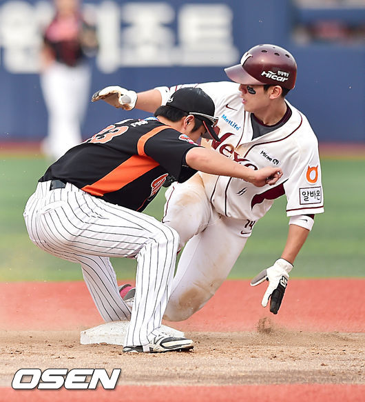 7일 오후 서울 목동구장에서 열린 '2014 한국야쿠르트 세븐 프로야구' 넥센 히어로즈와 롯데 자이언츠 경기, 7회말 1사 주자 1루 넥센 로티노 타석에서 서건창이 2루 도루에 성공하고 있다.