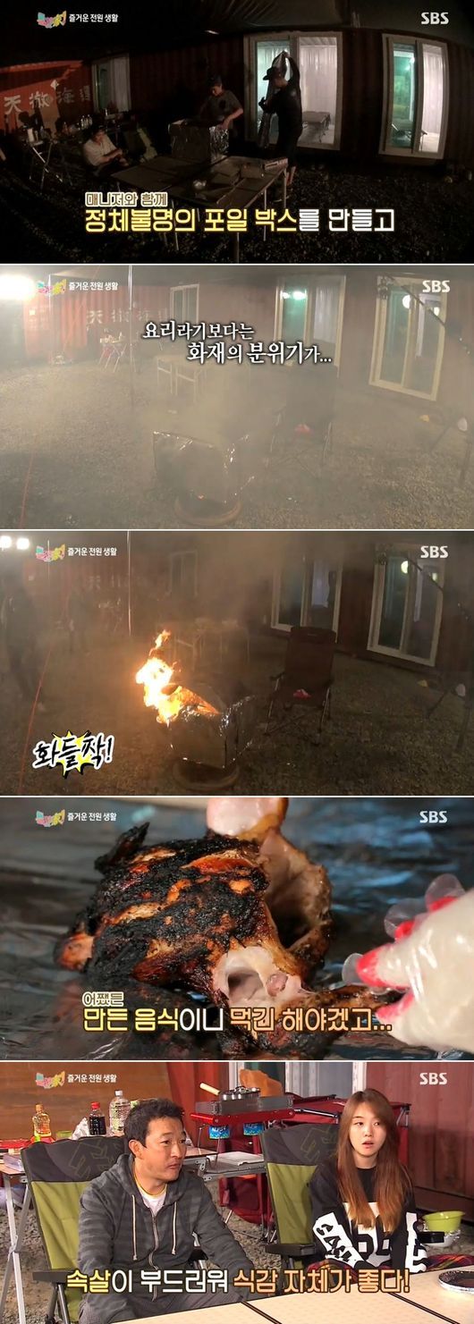 잠시 뒤 불에 올려놓은 포일박스 위로 연기가 치솟아 올랐고, 불이 붙기 시작했다. 이에 제작진은 “진짜 그대로 나둬”라며 이를 방치했고, 결국 다 타버린 닭만 남은 채 불이 꺼졌다.