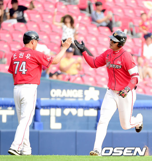 6회초 SK 공격 2사 만루 상황 김상현이 좌월 만루포를 날리고 그라운드를 돌며 조원우 코치와 인사를 나누고 있다.