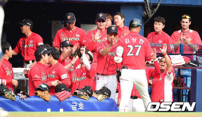 6회초 SK 공격 2사 만루 상황 김상현이 좌월 만루포를 날리고 더그아웃 동료들과 인사를 나누고 있다.
