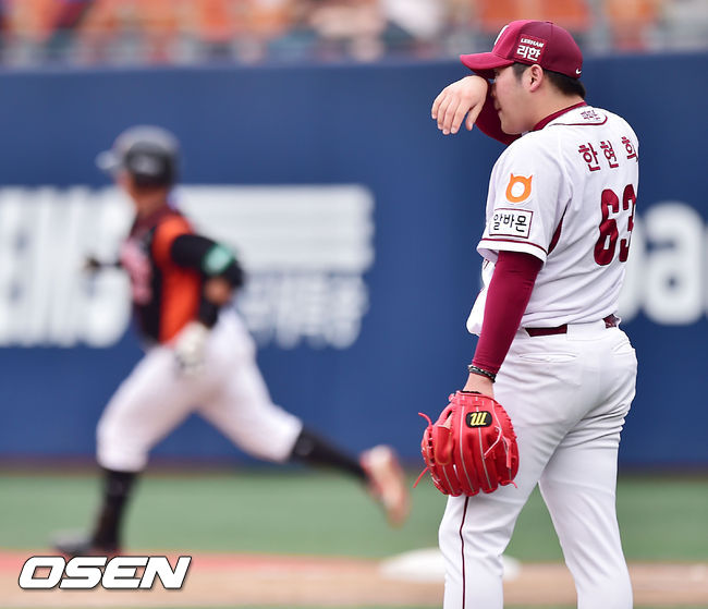 7일 오후 서울 목동구장에서 열린 '2014 한국야쿠르트 세븐 프로야구' 넥센 히어로즈와 롯데 자이언츠 경기, 8회초 1사 주자 1,2루 롯데 장성우에게 우월 스리런 홈런을 맞은 넥센 한현희가 아쉬워하고 있다.