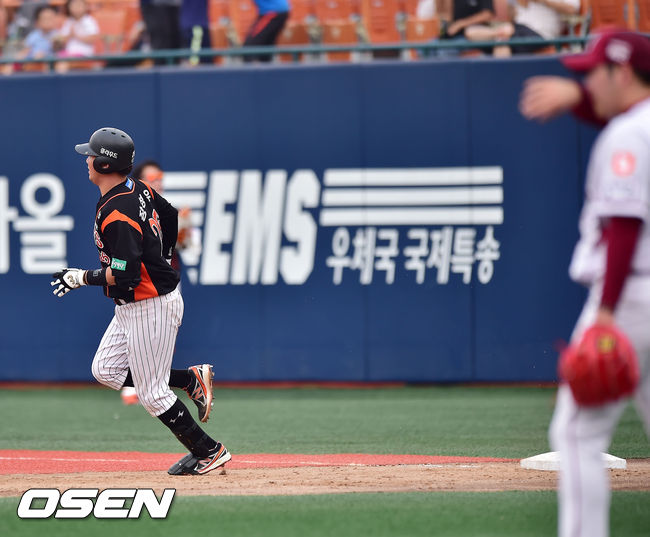 7일 오후 서울 목동구장에서 열린 '2014 한국야쿠르트 세븐 프로야구' 넥센 히어로즈와 롯데 자이언츠 경기, 8회초 1사 주자 1,2루 롯데 장성우가 우월 스리런 홈런을 날린 후 그라운드를 돌고 있다.