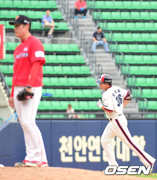 7회말 두산 공격 무사 1루 상황 오재일이 SK 선발 여건욱을 상대로 추격의 우월 투런포를 날리고 그라운드를 돌고 있다.