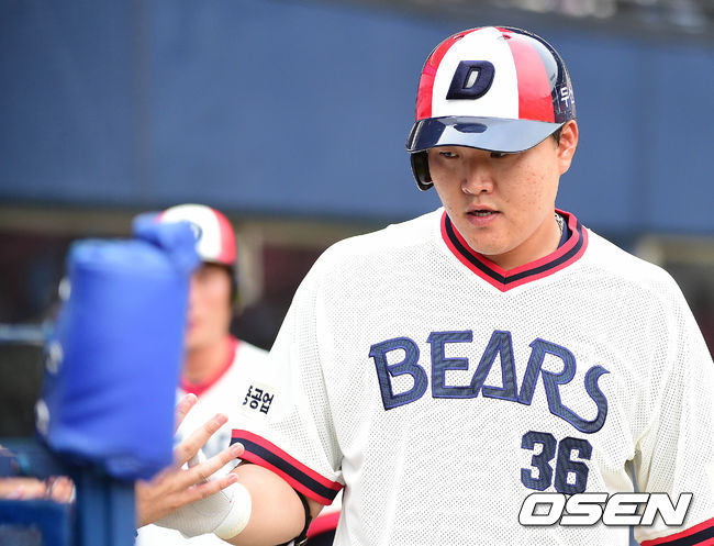 7회말 두산 공격 무사 1루 상황 오재일이 추격의 우월 투런포를 날리고 더그아웃 동료들과 인사를 나누고 있다.