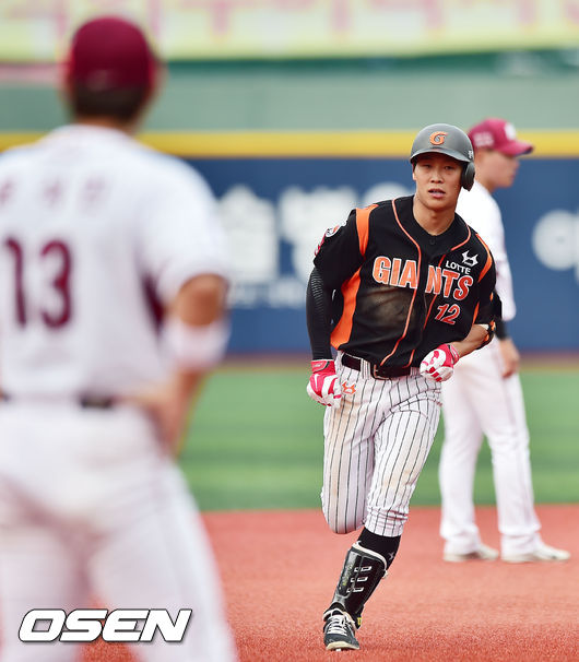 7일 오후 서울 목동구장에서 열린 '2014 한국야쿠르트 세븐 프로야구' 넥센 히어로즈와 롯데 자이언츠 경기, 8회초 2사 롯데 김민하가 우중월 솔로 홈런을 날린 후 그라운드를 돌고 있다.