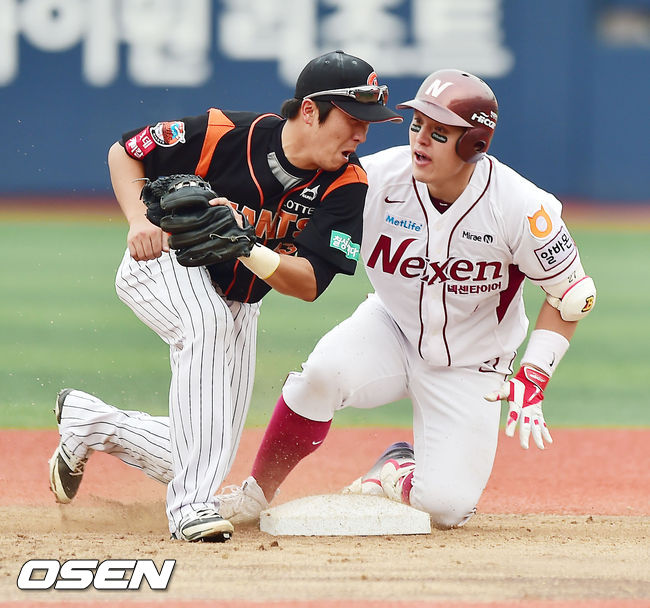 7일 오후 서울 목동구장에서 열린 '2014 한국야쿠르트 세븐 프로야구' 넥센 히어로즈와 롯데 자이언츠 경기, 8회말 2사 주자 1루 넥센 박동원이 좌익수 앞 안타를 날렸을때 2루에서 정훈과 충돌하고 있다.