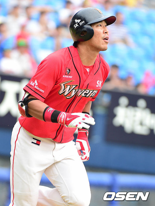 8회초 SK 공격 1사 주자없는 상황 한동민이 우월 솔로포를 날리고 그라운드를 돌고 있다.