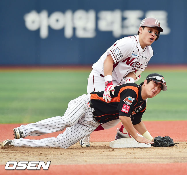 7일 오후 서울 목동구장에서 열린 '2014 한국야쿠르트 세븐 프로야구' 넥센 히어로즈와 롯데 자이언츠 경기, 8회말 2사 주자 1루 넥센 박동원이 좌익수 앞 안타를 날렸을때 2루에서 정훈과 충돌하며 박동원이 쓰러지는 정훈을 잡고 있다.