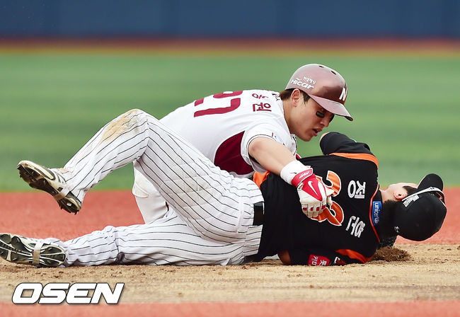7일 오후 서울 목동구장에서 열린 '2014 한국야쿠르트 세븐 프로야구' 넥센 히어로즈와 롯데 자이언츠 경기, 8회말 2사 주자 1루 넥센 박동원이 좌익수 앞 안타를 날렸을때 2루에서 정훈과 충돌한 후 정훈이 고통스러워하고 있다.