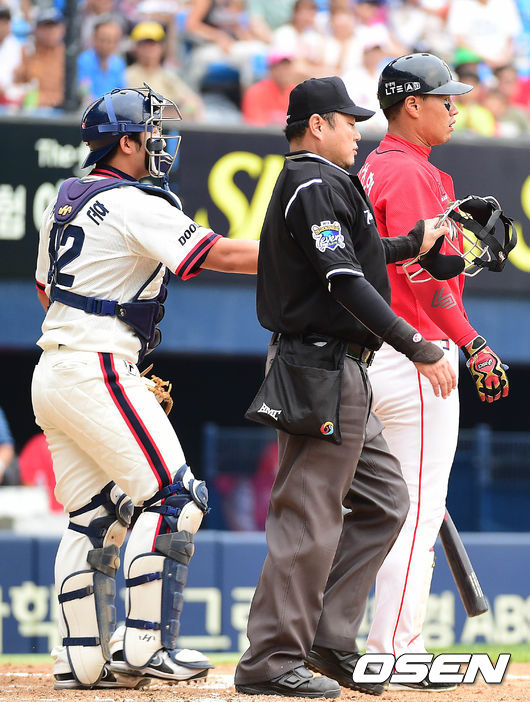 8회초 SK 공격 2사 주자없는 상황 김상현이 두산 투수 김강률의 몸쪽 높은 공에 어필하고 있다. 이를 말리고 있는 이영재 주심과 두산 포수 최재훈.
