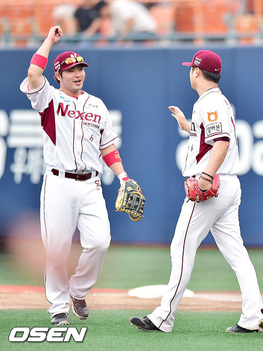 경기를 마치고 박병호와 손승락이 하이파이브를 하고 있다. / rumi@osen.co.kr