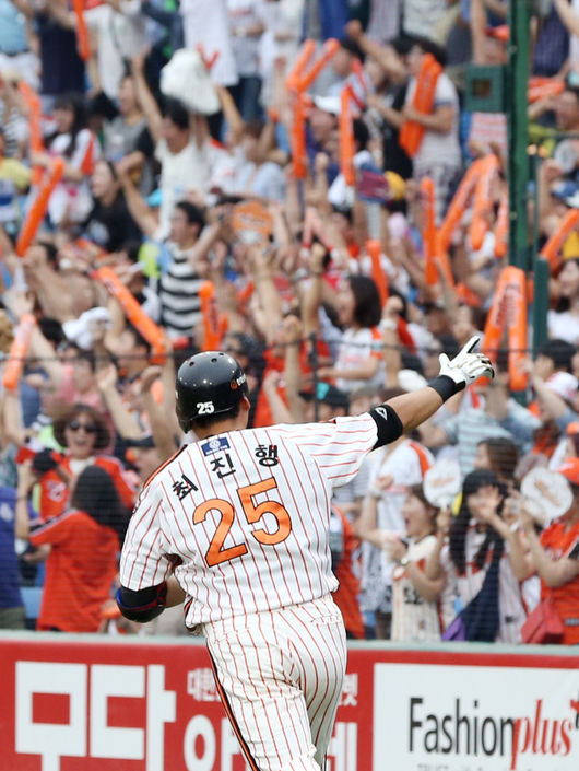 최진행의 끝내기 홈런은 개인 통산 2호. 지난 2010년 9월16일 대전 넥센전에서 연장 11회 끝내기 솔로 홈런을 친 이후 3년11개월21일로 일수로는 1452일 만에 끝내기 홈런의 주인공이 됐다. 지난 6일 LG전 홈런 포함 2안타에 이어 2경기 연속 불방망이를 쳤다.